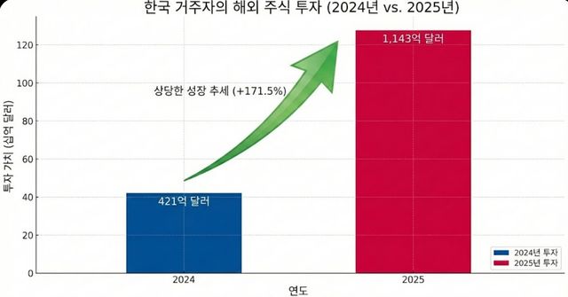 지난해 거주자의 해외 주식 투자는 유례없는 호황을 누렸다. 12월 한 달간 내국인의 해외 증권투자는 143억 7000만 달러 증가했으며 이 중 주식 투자가 118억 3000만 달러를 차지해 전체 증가액의 대부분을 견인했다. 2025년 연간 누적 기준 내국인의 해외 주식 투자액은 1143억 5,000만 달러로 집계되어 전년도 기록인 421억 6000만 달러보다 두 배 이상 폭증한 수치를 기록했다. 이는 서학개미로 불리는 개인 투자자들과 국내 기관들의 해외 자산 배분 수요가 극대화된 결과로 분석된다.
