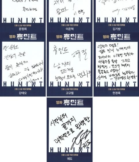 먼저 “간만에 재밌다. 류승완의 아름다움을 보다니♡”(황정민), “추운 겨울을 뚫고 가열차게 달린 ‘휴민트’. 따뜻한 온기로 극장을 하나로 만들기를”(박보검), “휴민트. 액션, 긴장감 대박입니다! 시간 가는 줄 모르고 봤어요!”(정해인), “모든 배우 선배님들의 멋진 열연 잘 봤습니다! 휴민트 화이팅!”(이준호), “액션, 로맨스 다 하는 흥행 금메달 ‘휴민트’”(임윤아), “한순간도 긴장의 끈을 풀지 못한 채 숨죽이고 잘 봤습니다. 대박 기원합니다!”(강태오), “충분히 뜨겁고 충실히 차가운… 배우들의 열연에 박수를. ‘휴민트’ 화이팅!”(조여정), “감정도, 액션도, 찐하디 찐하다!”(김종수), “설 연휴에 꼭 봐야 하는 영화!”(이상이), “신명 나는 총격전 대박입니다..♡”(최수영), “보는 내내 주먹이 불끈 쥐어지고 가슴은 뜨거워지고 눈시울이 붉어지는 영화. 그렇다! 류승완이 돌아온 것이다!! ‘휴민트’ 만세!!!”(윤경호) 등 대한민국 대표 배우들이 친필 추천사를 통해 칭찬을 남겼다.