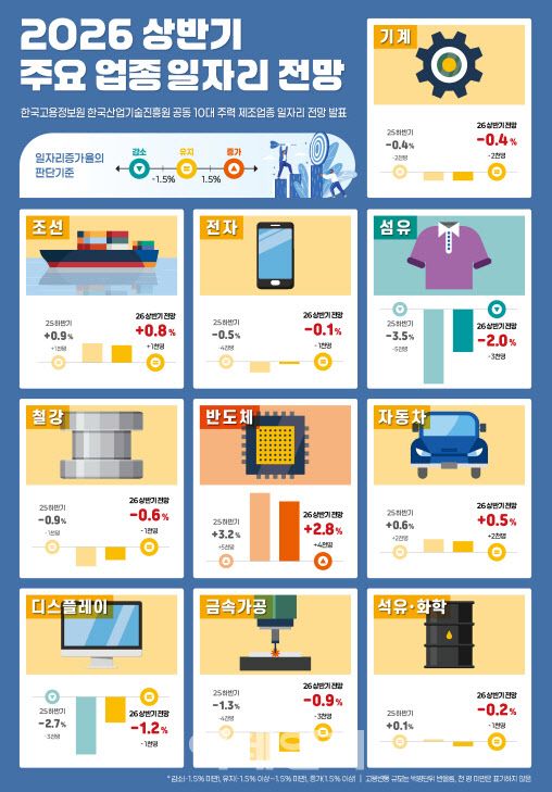 한국고용정보원과 한국산업기술진흥원은 6일 ‘2026년 상반기 주요 업종 일자리 전망’을 발표했다. 이번 전망은 기계, 조선, 전자, 섬유, 철강, 반도체, 자동차, 디스플레이, 금속가공, 석유·화학 등 10대 주력 제조업을 대상으로 했다.