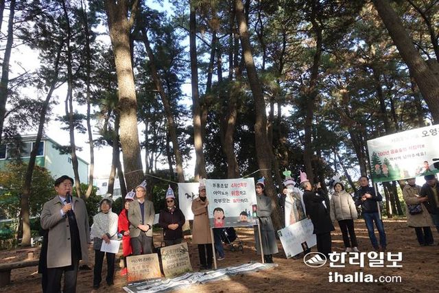오영훈 지사가 지난해 5일 오후 서귀포학생문화원 소나무 숲을 찾아 공론화 과정을 통해 솔숲 관통 도로 개설 방향을 결정하겠다는 입장을 밝히고 있다. 한라일보 자료사진.