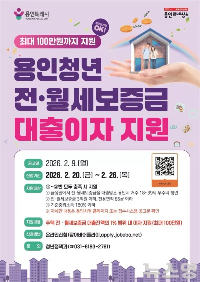 (뉴스영 이현정 기자) 용인특례시가 청년층의 주거비 부담을 덜고자 전월세 보증금 대출이자를 지원한다고 6일 밝혔다.