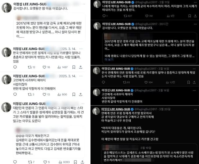 이 감독은 최근까지도 SNS를 통해 김수현과 '리얼'을 둘러싼 논란, 고(故) 김새론 관련 의혹, 연예계·언론·법조계의 유착을 주장하는 글을 지속적으로 게시해 왔습니다.