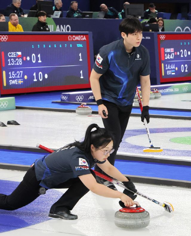 김선영-정영석 조는 6일(현지시간) 이탈리아 코르티나담페초의 코르티나 컬링 올림픽 스타디움에서 열린 대회 컬링 믹스더블 라운드 로빈 4차전에서 영국의 제니퍼 도즈-브루스 마워트 조에 2-8로 졌다.
