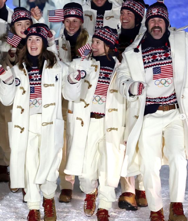 미국은 자국을 대표하는 패션디자이너 랄프 로렌으로 맞불을 놓았다. 미국 개회식 단복은 겨울의 순백을 강조한 더플 코트와 팬츠로 구성됐다. 여기에 성조기와 오륜이 들어간 페어아일 니트, 술 달린 모자와 벙어리장갑이 더해졌다. 랄프 로렌 측은 “선수들이 평온함과 초현실적 분위기를 느꼈다”고 설명했다.