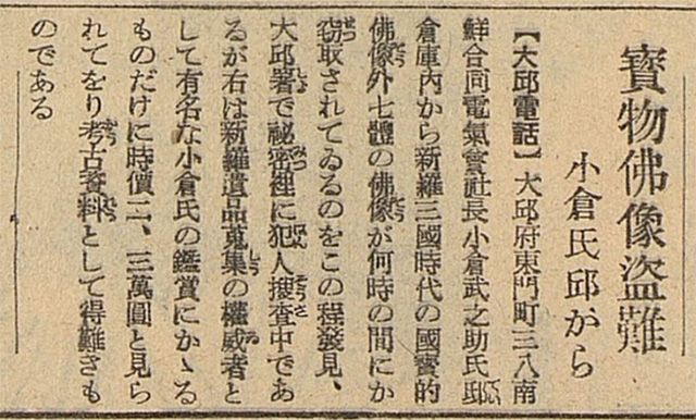 대구부 히가시몬초(東門町) 38 남선합동전기회사장 오구라 다케노스케씨 저택 창고 내에서 신라 삼국시대의 국보급 불상 외 7체의 불상이 어느샌가 절취되어 있는 것을 요즘 발견, 대구서에서 비밀리에 범인을 수사하고 있는데, 이와 같은 신라 유품 수집의 권위자로서 유명한 오구라씨가 소장하고 있었던 것인 만큼 시가 2, 3만 엔으로 보여지고 있으며 고고 자료로서 얻기 어려운 것이다.