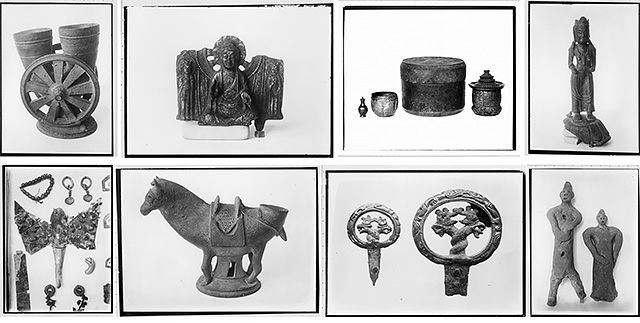 해당 유물 중 대표적인 것으로 위의 이미지와 같이 왼쪽 상단부터 차례대로 '수레모양토기', '금동일광삼존불상', '금동제삼층탑문사리합/은제타출보탑형사리기/은제타출당초문사리기/사리병', '금동보살입상', '접형 관식과 장신구 각종', '마형토우', '쌍룡문환두대도병두', '인물형토우' 등이 있었다. 이 유물들은 사리병을 제외하고 현재 도쿄국립박물관에 오구라 컬렉션으로 소장되어 있다.