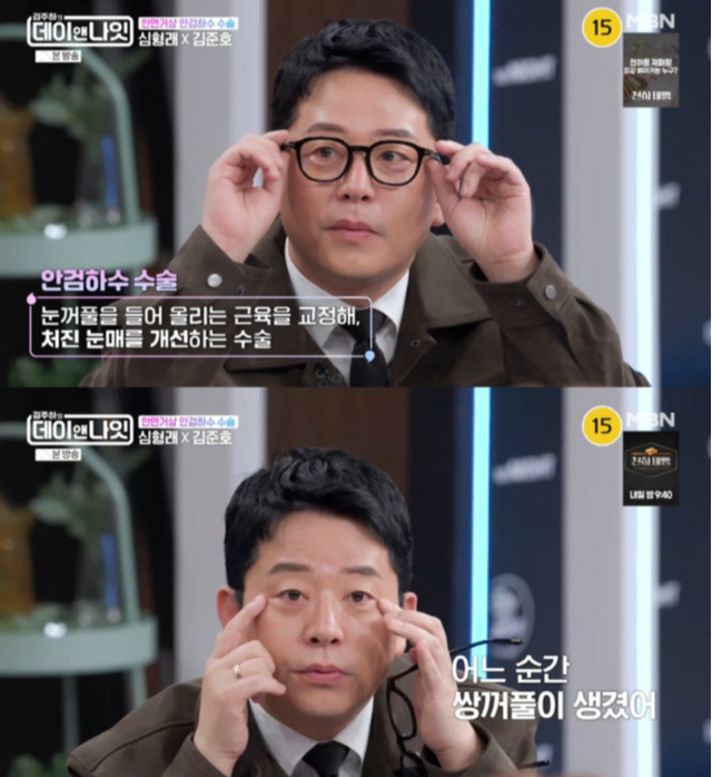 김준호는 “얼굴 개인기를 하니까 눈에 피로감이 상승하면서 주글주글해졌다”고 설명했다. 이어 “눈썹 지방 제거는 10년 전에 했고, 눈썹 밑 안검하수라고 살짝 댕겼다”고 말하며 수술 당시와 수술 후 모습을 공개해 웃음을 안겼다.