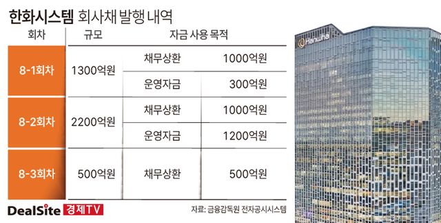 6일 업계에 따르면 한화시스템은 제8-1‧2‧3회 무기명식 이권부 무보증 공모사채 발행액을 4000억원으로 확정했다. 제8-1차로 1300억원을 마련하고 제8-2회차 2200억원, 제8-3회차 500억원으로 구성된다.