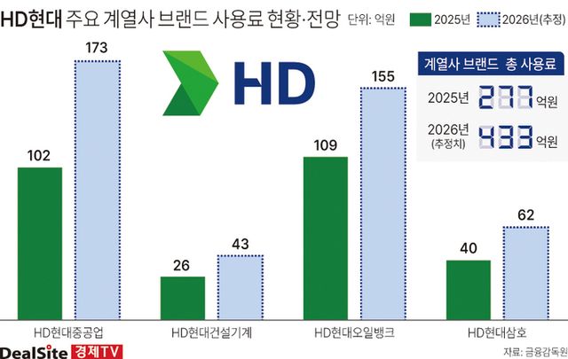 6일 금융감독원 전자공시시스템에 따르면 HD현대는 최근 주요 계열사와 체결한 새로운 상표권 계약 금액을 공시했다. 이를 기준으로 올해 예상되는 상표권 수익은 ▲HD현대중공업 173억원 ▲HD현대건설기계 43억원 ▲HD현대오일뱅크 155억원 ▲HD현대삼호 62억원이다. 전체 상표권 수익은 433억원으로, 전년 대비 55.9% 증가했다. 계열사별 계약 금액도 대부분 50% 내외 상향 조정됐다.