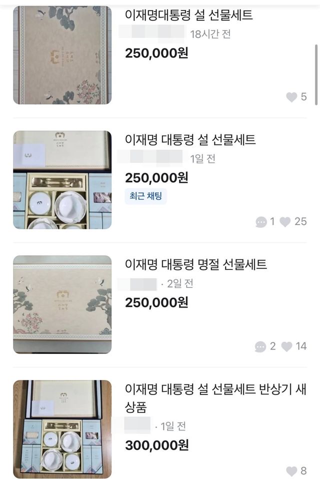 이재명 대통령의 설 명절 선물세트가 발송된 지 얼마 지나지 않아 중고거래 플랫폼에 매물로 출현했다.
