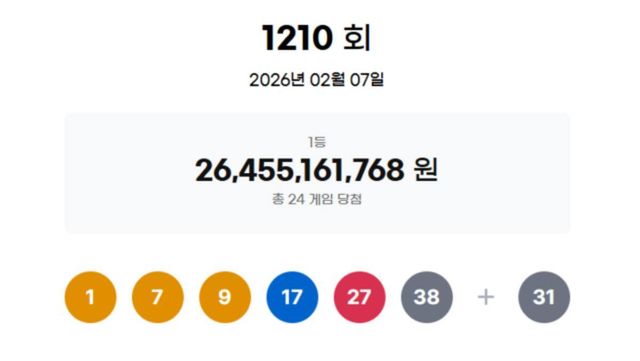 7일 진행된 제1210회 로또복권 추첨에서 1등 당첨 번호는 '1, 7, 9, 17, 27, 38'로 확정됐다. 2등 보너스 번호는 '31'이다.