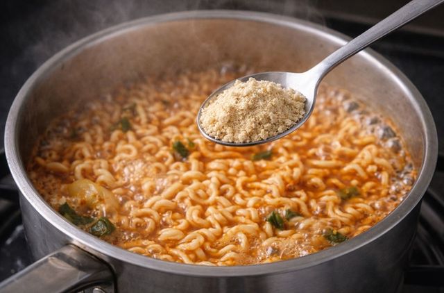 라면에 콩가루를 넣는 모습. 기사 이해를 돕기 위해 AI를 활용해 제작한 자료 사진입니다. 실제 모습과 다소 차이가 있을 수 있습니다.