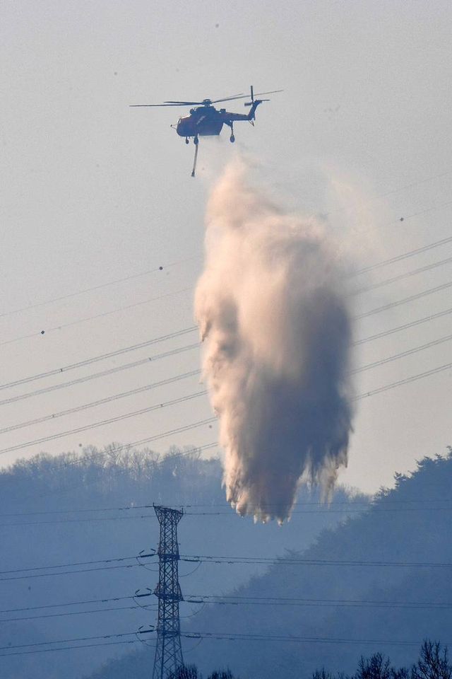 8일 오후 경북 경주시 문무대왕면 입천리에서 발생한 산불이 강풍을 타고 확산되고 있는 가운데 산림청 초대형 핼기(S-64)가 송전선로를 피해 진화 작업을 벌이고 있다. 이날 오후 정부는 신속한 진화를 위해 국가소방동원령을 발령했다 / 뉴스1