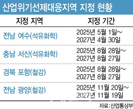 이런 업황 악화에 대응해 정부는 전남 여수·충남 서산(석유화학), 경북 포항·전남 광양(철강) 등을 잇달아 산업위기선제대응지역으로 지정해 왔다.