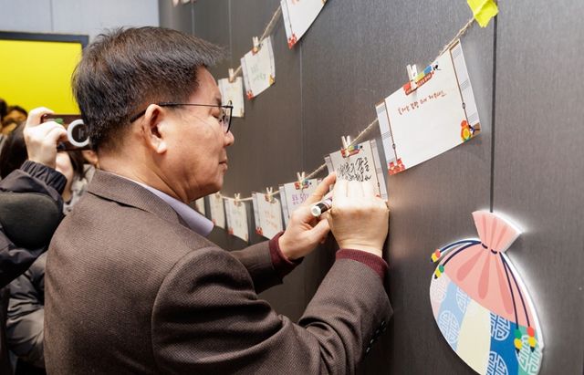 | ▲ ‘도화 뭐하니?’ 축제에서 청소년들에게 전할 덕담을 적고 있는 박강수 마포구청장 |