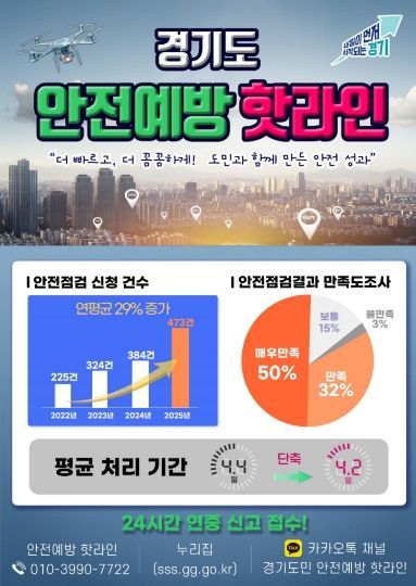 경기도가 2025년 ‘안전예방 핫라인(010-3990-7722)’ 운영을 통해 전년도 384건 대비 23% 증가한 473건의 무료 안전점검을 실시했다고 8일 밝혔다.