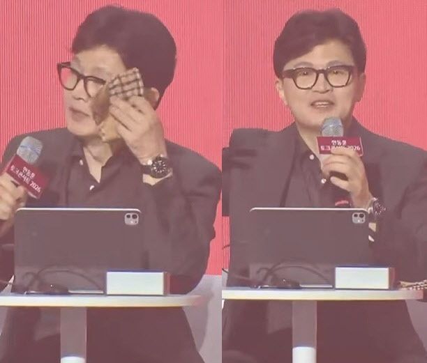 이날 한 전 대표는 공직·정치 생활을 회고하며 지난 20년을 돌아보는 과정에서 눈을 여러 번 깜빡이며 손수건으로 눈물을 닦았다.