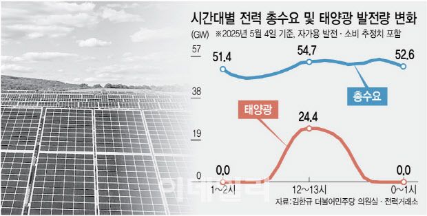 어린이날과 주말이 겹친 연휴 영향으로 전력수요는 연중 최저 수준인 54.7기가와트(GW)까지 내린 반면, 일조량이 좋은 봄 한낮 태양광 발전량이 24.4GW까지 늘어난 데 따른 것이다.