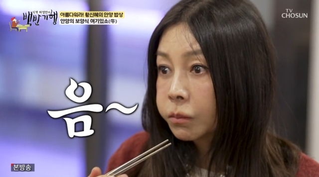배우 황신혜가 TV조선 ‘식객 허영만의 백반기행’에서 안양의 맛과 함께 자신의 이야기를 풀어냈다.