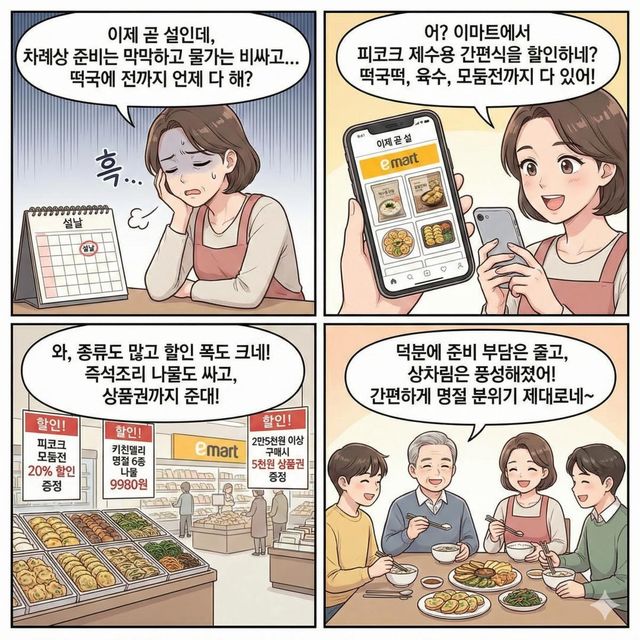 명절이 다가오면 몸보다 마음이 먼저 바빠진다. 차례상을 차릴지 말지부터 고민인데 막상 준비를 하기로 하면 장보기 목록이 끝이 없다. 떡국떡과 육수는 기본이고 전과 나물, 튀김에 후식까지 하나씩 떠올리다 보면 장바구니가 무겁고 계산대 앞에서는 한 번 더 숨이 막힌다.