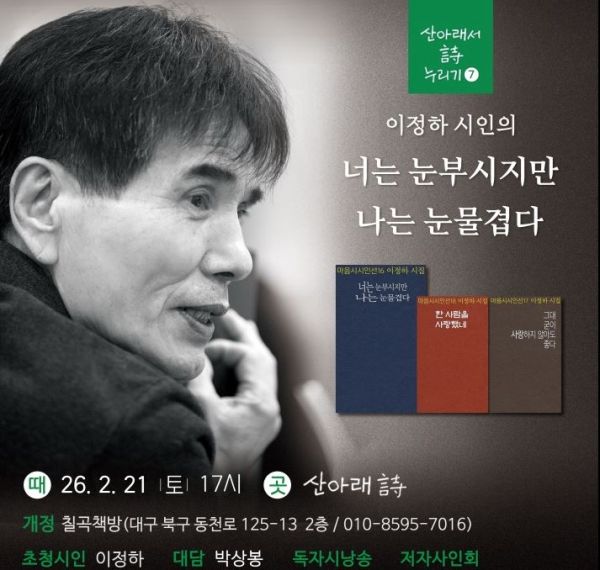 행사는 대구 북구 동천로 125-13, 2층에 위치한 개정 칠곡책방에서 열리며, 문의 및 참가신청은 010-8595-7016으로 하면 된다. 시인과의 만남 이후에는 저자 사인회에 이어 만찬이 예정돼 있다.
