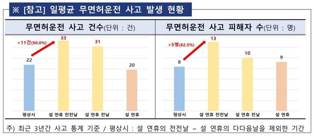 사고 유형별로 보면 음주운전과 무면허운전 증가세가 두드러졌다. 본격적인 귀성 직전인 설 연휴 전전날 음주운전 사고는 하루 평균 72건으로 평상시보다 24.1% 늘었고 이로 인한 피해자도 22명으로 15.8% 증가했다.