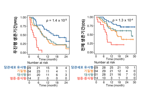 연구팀은 치료 전 확보한 108명의 종양 조직을 대상으로 표적 유전체 분석과 RNA 시퀀싱 분석을 시행해 담도암을 네 가지 분자 아형으로 분류했다. 분류된 아형은 담관세포 유사형, 기질형, 대사형, 염증-증식형이다. 담관세포 유사형 아형에서 젬시아 치료 효과가 가장 우수했으며, 염증-증식형 아형은 TP53 변이와 면역억제적 종양 미세환경과 연관돼 상대적으로 불량한 예후를 보였다.