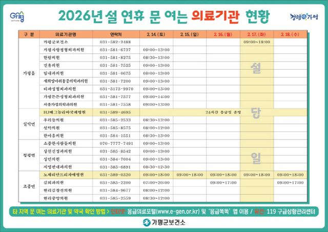 연휴 기간 문을 여는 의료기관 및 약국 정보는 △가평군청 및 가평군보건소 홈페이지 △119구급상황관리센터 △응급의료포털 △보건복지콜센터(129)에서 확인할 수 있다.