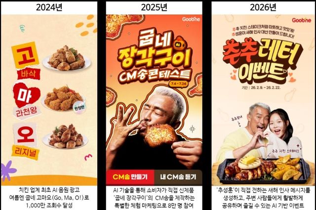앞서 2024년 치킨업계 최초로 AI 음원을 활용해 만든 광고 ‘여름엔 굽네 고마오’를 공개해 1,000만 조회수를 달성한 바 있다. 이어 신제품 출시를 기념해 소비자가 직접 CM송을 제작하는 ‘AI CM송 콘테스트’는 약 8만 명이 참여하며 ‘굽네 장각구이’가 초단기간 밀리언셀러 기록을 세우는 데 힘을 보탰다.
