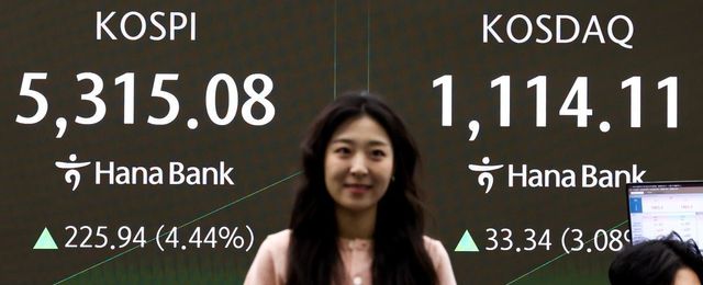 코스피가 상승 출발한 9일 서울 중구 하나은행 본점 딜링룸 전광판에 증시 시황이 표시되어 있다. / 뉴스1