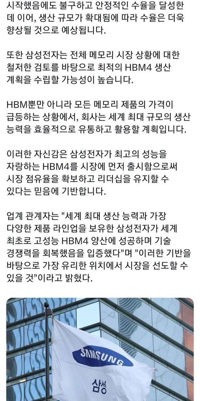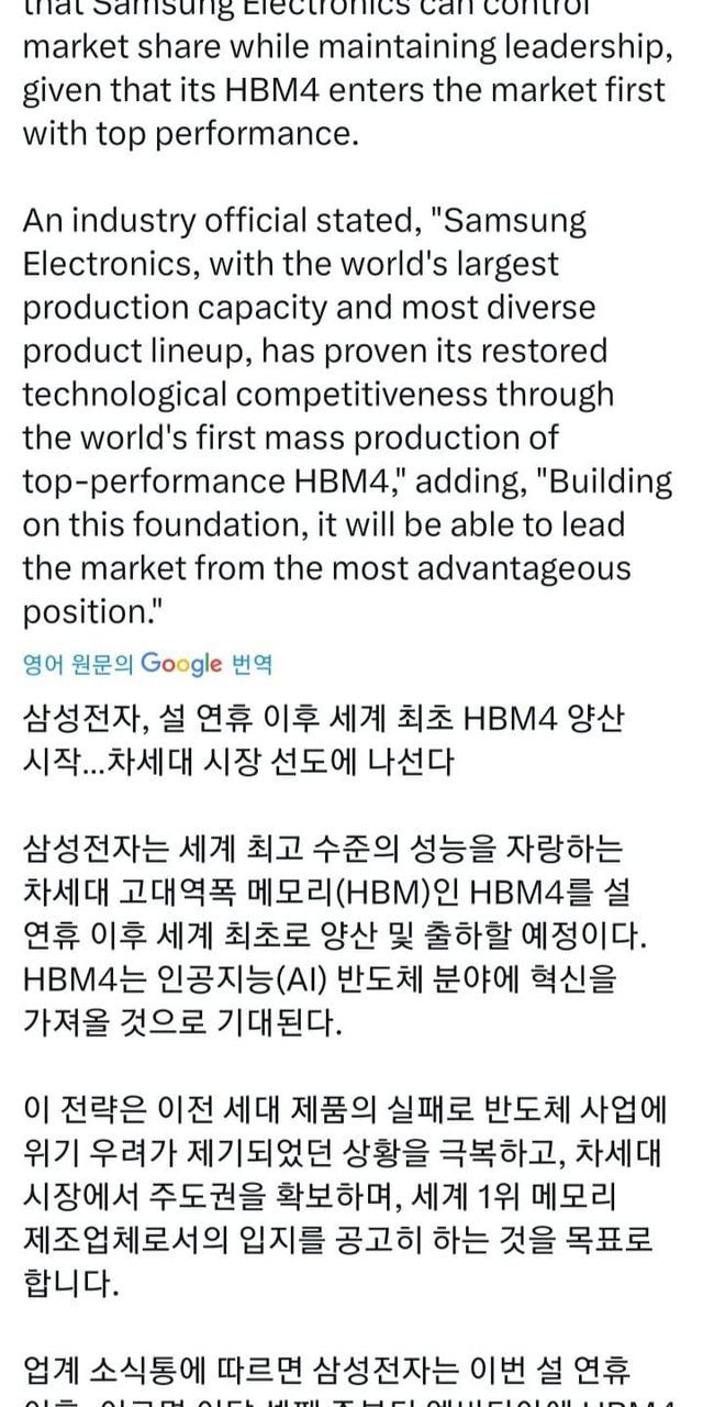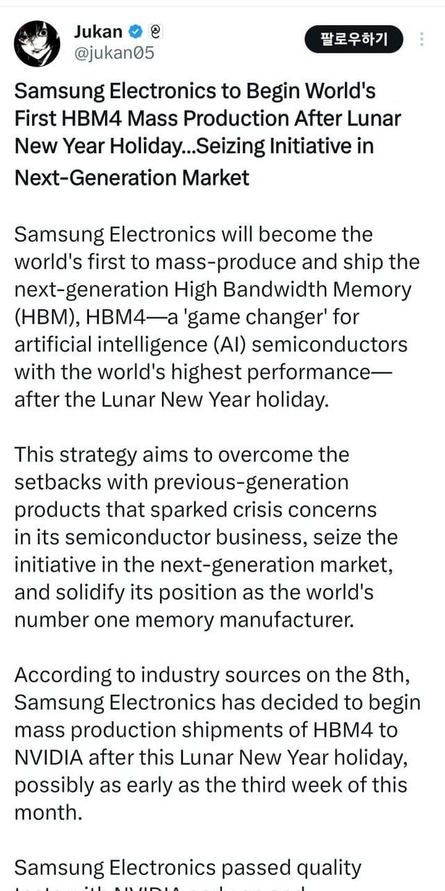 • 한 줄 요약: 삼성이 HBM4를 설 이후 세계 최초로 양산해 엔비디아에 공급하며, 차세대 AI 메모리 시장 주도권을 노린다는 기사.