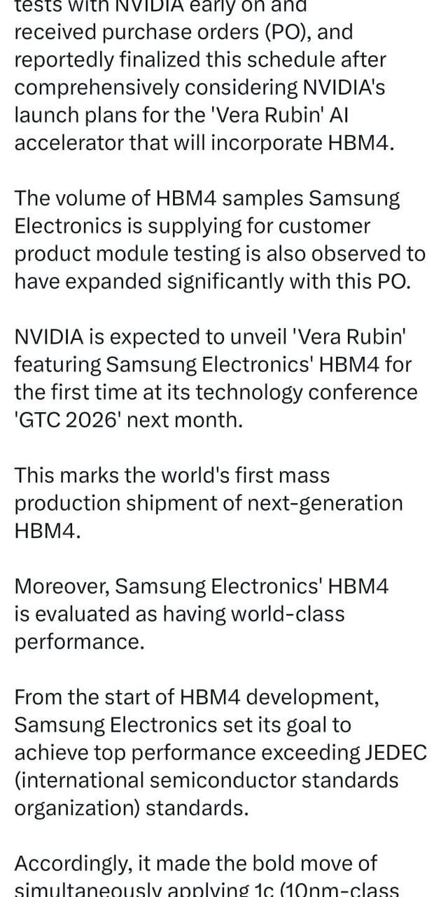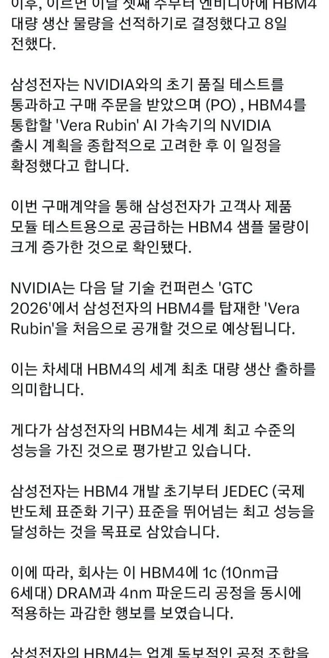 • 엔비디아(NVIDIA) 품질 테스트를 통과했고 구매 주문(PO) 도 받아, 엔비디아에 HBM4를 공급하는 일정이 잡혔다는 내용.
