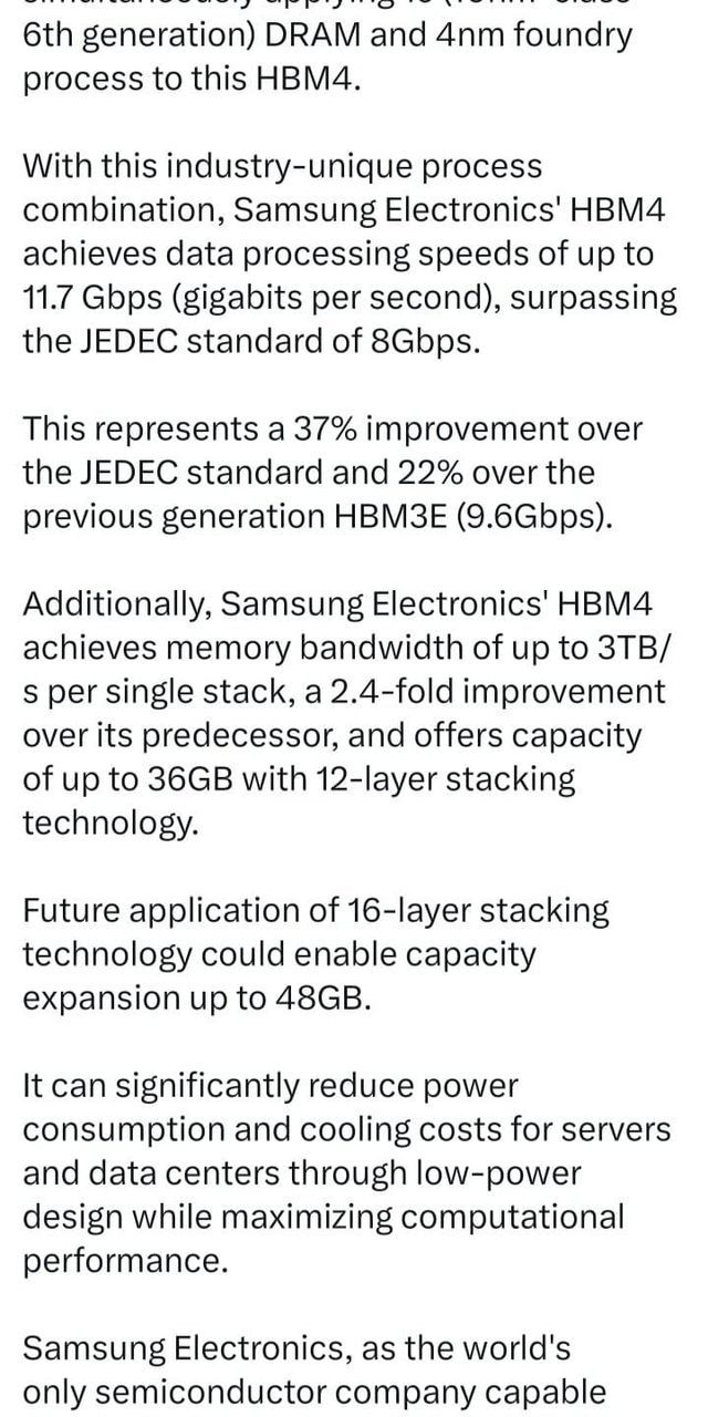 • 성능은 최대 11.7Gbps로, JEDEC 기준(8Gbps) 및 이전 세대 HBM3E(9.6Gbps) 보다 빠르다고 주장함.