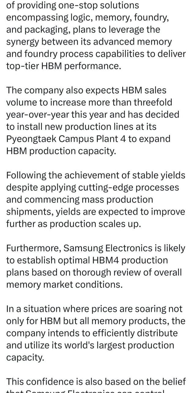 • 삼성은 HBM 판매량이 올해 3배 이상 증가할 것으로 보고, 평택 P4에 신규 라인을 설치해 생산능력을 늘린다고 함.