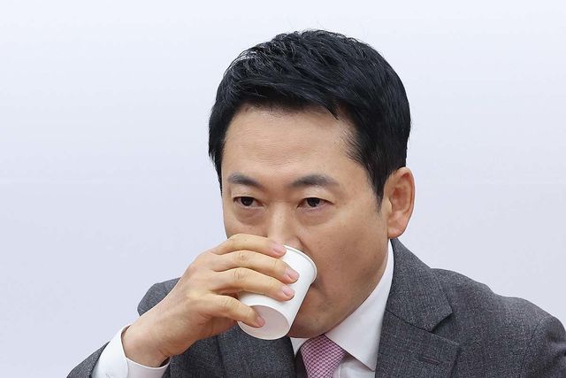 장동혁 국민의힘 대표가 9일 서울 여의도 국회에서 열린 최고위원회의에서 목을 축이고 있다. / 뉴스1