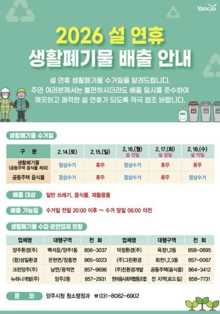 [와이뉴스] 양주시가 설 연휴 기간 시민과 방문객의 불편을 줄이기 위해 ‘2026년 설 연휴 생활폐기물 관리 대책’을 추진한다.