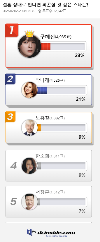 커뮤니티 포털사이트 디시인사이드는 2일부터 8일까지 ‘결혼 상대로 만나면 피곤할 것 같은 스타는?’라는 주제로 투표를 진행했다. 총 2만2342표가 집계된 가운데 구혜선이 4935표(23%)로 1위를 차지했다.