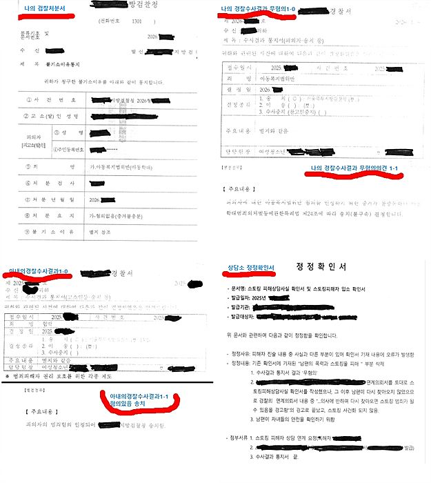 A씨는 글과 함께 ▲본인의 검찰처분서(혐의없음) ▲경찰 수사결과 통지서 ▲상담소 정정확인서 ▲아내의 수사결과 통지서 등을 증거 자료로 제시했다.