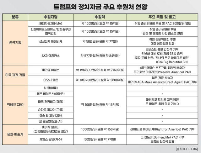 르데스크 취재 결과 트럼프 대통령의 '금고'에는 국내 기업들의 후원금도 포함돼 있는 것으로 나타났다. 미국 연방선거관리위원회(FEC)가 공개한 자료에 따르면 현대자동차 미국법인(HMA)은 2025년 1월 6일 100만달러(원화 약 14억6000만원)를 '트럼프-밴스 취임식 준비위원회'(Trump-Vance Inaugural Committee, Inc.)에 냈다. 한화에어로스페이스와 한화솔루션의 미국법인인 한화디펜스 USA와 한화큐셀아메리카 역시 각각 50만달러(원화 약 7억3000만원)를 후원했다. 삼성전자 아메리카도 31만5000달러(원화 약 4억6000만원)를 해당 조직에 후원했다. 트럼프-밴스 취임식 준비위원회는 트럼프 대통령과 밴스 부통령의 취임식 관련 행사 기획 및 자금 조달을 위해 설립된 공식 비영리 조직이다.