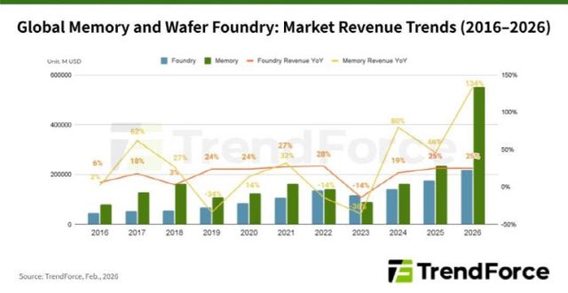 9일 시장조사업체 트렌드포스에 따르면 올해 메모리 시장 매출은 전년 대비 134% 증가한 5516억달러로 추정된다. 같은 기간 파운드리 시장 매출은 25% 늘어난 2187억달러로, 메모리 시장 규모가 약 2.5배에 달할 것으로 관측된다. 두 시장 모두 사상 최대 매출 기록이 예상되지만 성장 속도에서는 뚜렷한 격차가 나타날 전망이다.