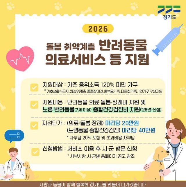 변희정 경기도 반려동물과장은 “취약계층의 외로움을 덜어줄 수 있는 반려동물이 더 오래 건강하게 곁을 지킬 수 있도록 지원 규모도 확대하고 노령 동물 종합건강검진 지원도 신설했다”며 “경기도는 사람과 동물이 서로의 온기를 나누며 끝까지 함께 걸어갈 수 있는 따뜻한 반려 문화를 만들어 가겠다”고 말했다.