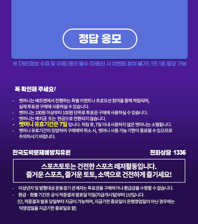프로모션을 통해 지급되는 벳머니는 실제 투표권 구매에만 사용할 수 있으며, 적립일로부터 7일 이내 사용하지 않을 경우 자동 소멸된다. 벳머니는 현금이나 예금으로 전환되지 않는다는 점을 유의해야 한다.
