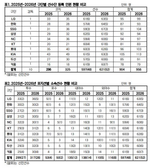KBO는 10일 2026년 KBO 리그 소속 선수 명단을 공시했다. 10개 구단은 총 621명의 선수를 등록했다. 597명이 등록했던 2025년보다 24명이 늘어났다.