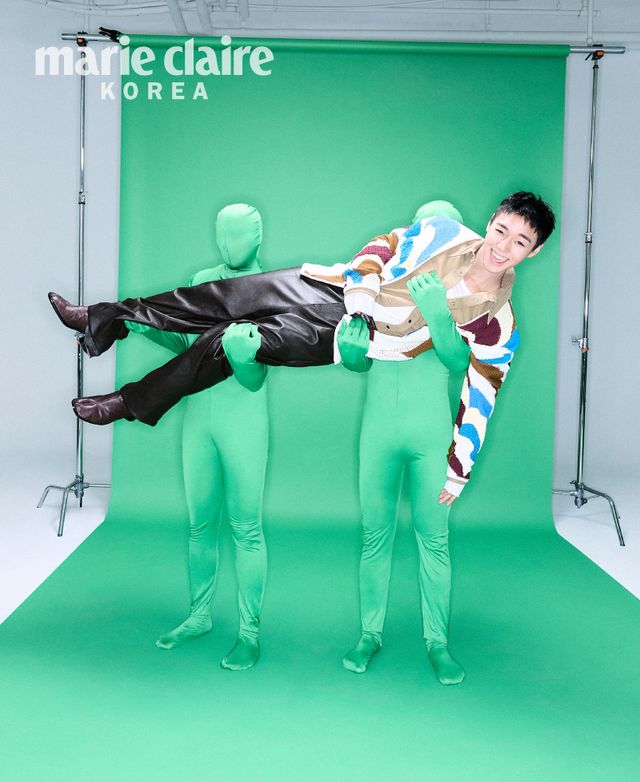 박지훈 체크 재킷과 팬츠 모두 Dolce & Gabbana, 레드 베스트와 카디건 모두 Barrie, 워커 Camper, 선글라스 Gentle Monster.
