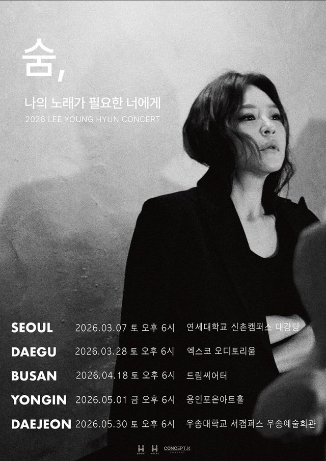 이영현은 오는 3월 28일 대구 엑스코 오디토리움을 시작으로 4월 18일 부산 드림씨어터, 5월 1일 용인 포은아트홀, 5월 30일 대전 우송예술회관에서 전국 투어 콘서트 ‘나의 노래가 필요한 너에게 - 숨’의 여정을 이어간다. 앞서 투어 공연의 시작을 알렸던 서울 공연에 이어 4개 도시의 일정이 모두 확정된 것.