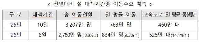 전년대비 설 대책기간중 이동수요 예측 / 국토교통부 제공