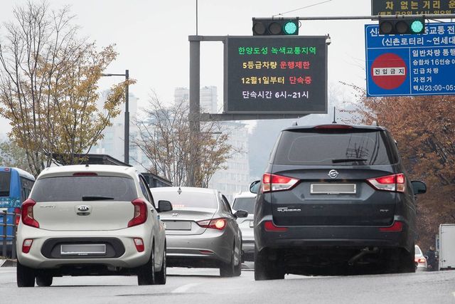 서울 사대문 안 녹색교통지역 배출가스 5등급 차량 단속 첫 날인 2019년 12월 1일 서울시내 진입 도로 전광판에 운행제한 안내문이 나오고 있다 / 뉴스1