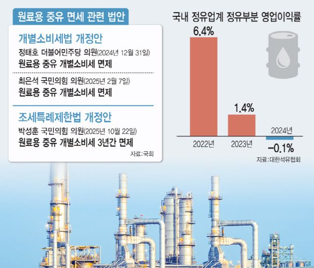 국회에서도 관련 법안이 다수 발의됐지만, 정부의 반대로 통과되지 못한 채 계류 중이다. 정태호 더불어민주당 의원과 최은석 국민의힘 의원은 각각 원료용 중유 개소세 면제를 담은 개별소비세법 개정안을 발의했고, 박성훈 국민의힘 의원은 3년간 한시 면제를 골자로 한 조세특례제한법 개정안을 제안했다.