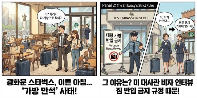 서울 광화문 주한 미국대사관 인근 스타벅스 매장이 이른 아침 시간대 항공사 신입 승무원들의 가방으로 채워지면서 이용객 불편 논란이 이어지고 있다. 비자 면접을 앞둔 승무원들이 매장에 짐을 둔 채 자리를 비우는 사례가 반복되고 있다는 지적이다.