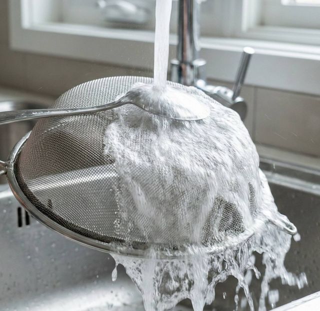 AI툴로 생성한 자료사진. 채반을 한 손에 들고, 다른 손으로 숟가락을 뒤집어 볼록한 부분을 위로 향하게 만든다. 이제 물줄기가 숟가락에 닿도록 해보자. 물이 숟가락에 부딪히며 퍼져 흐르면서 채반 전체에 고르게 닿는다. 거품을 씻어낼 때 훨씬 수월하다.